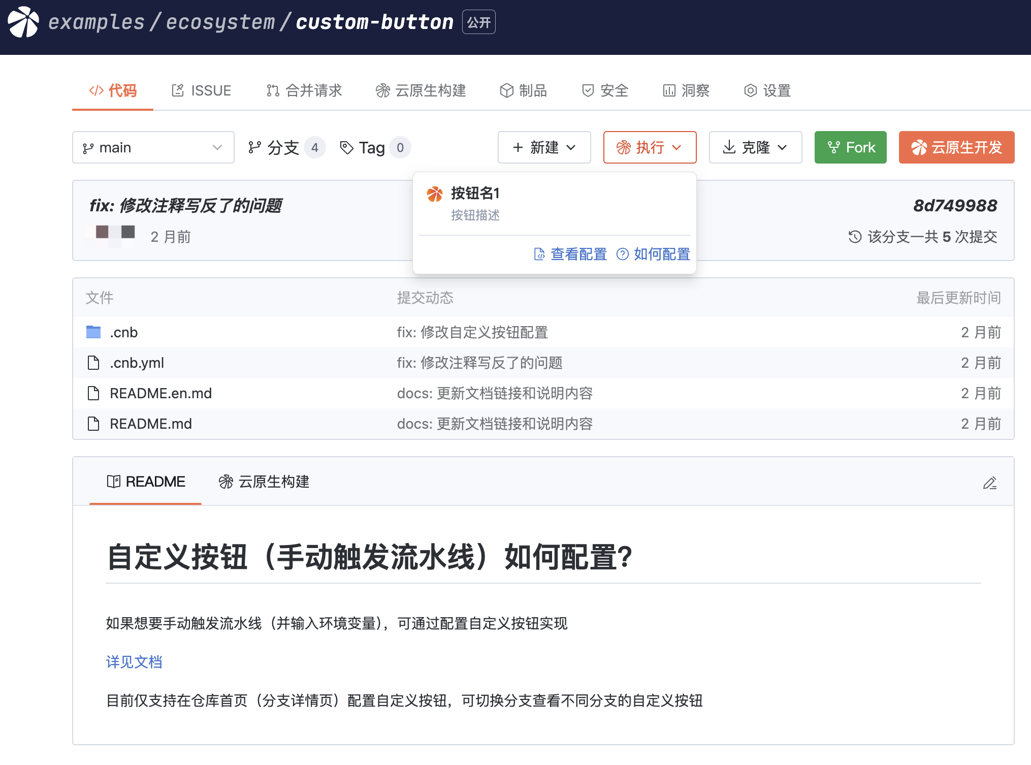 在仓库根目录下增加 .cnb/web_trigger.yml 文件用于配置自定义按钮。 注意 .cnb/web_trigger.yml 配置文件中不支持 include 和 imports 语法。