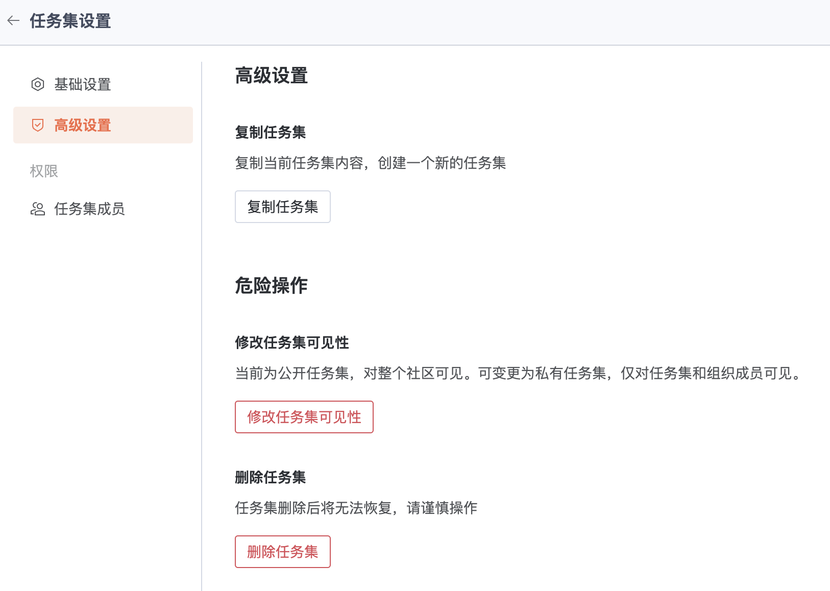 修改任务集可见性会影响任务集的访问范围,删除任务集后数据无法恢复,需谨慎操作。