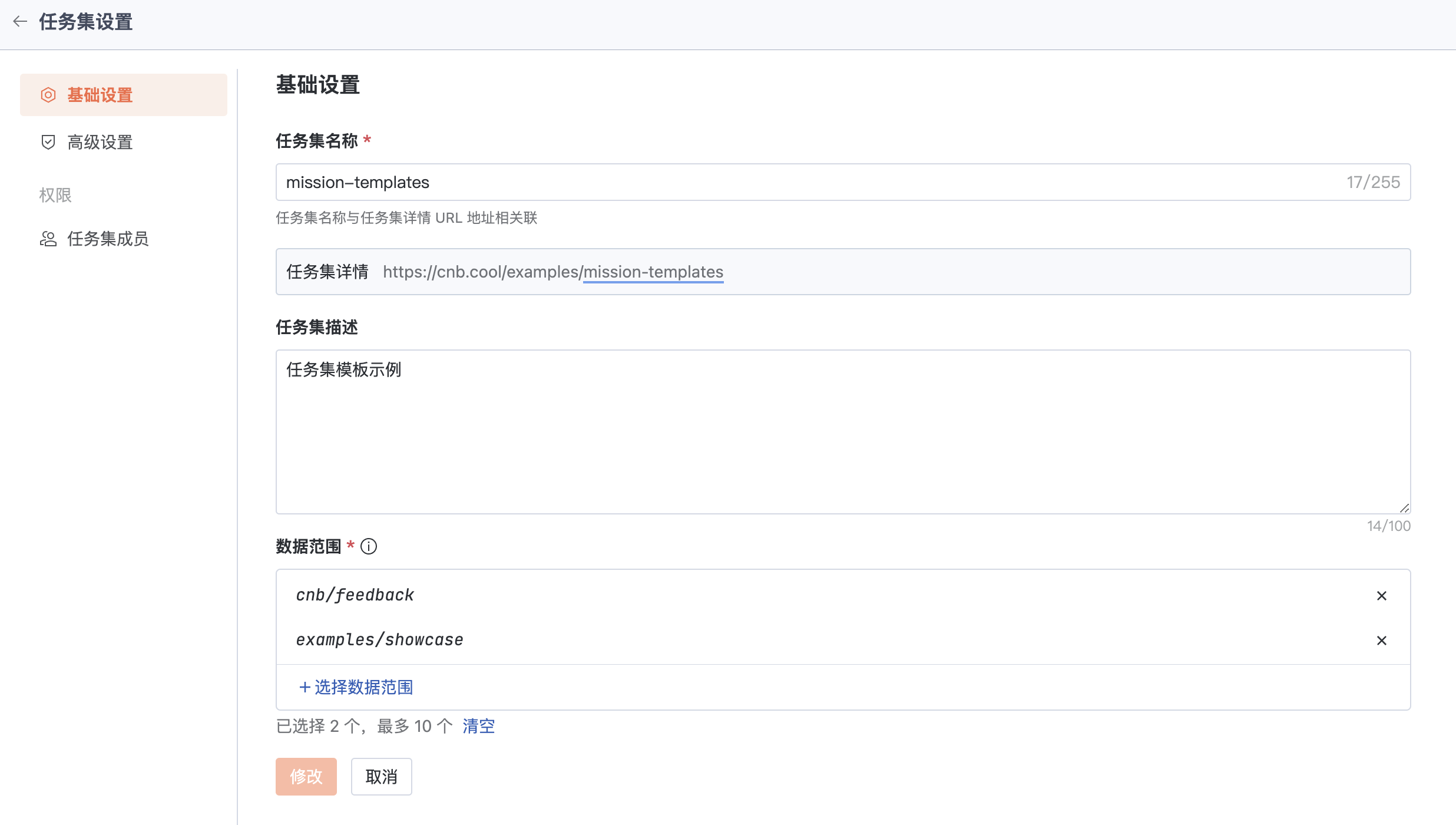 可以修改任务集名称和编辑任务集的数据范围等任务集的基础信息。