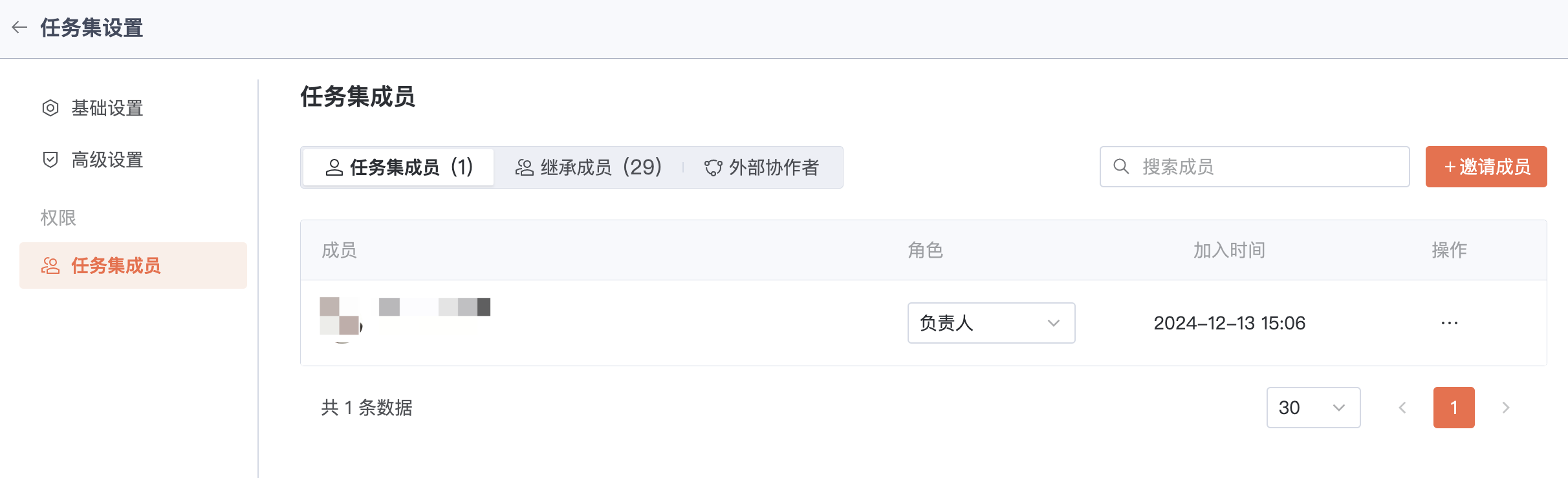 默认继承上级组织的所有成员权限关系。此外,还可单击邀请成员直接邀请成员加入当前任务集成为“任务集成员”或“外部协作者”。其中,外部协作者适用于一些临时参与协作的用户。