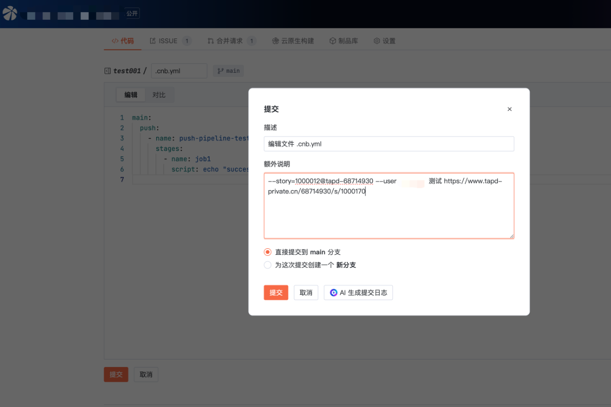 代码提交:提交云原生构建代码时添加对应关键字可关联 TAPD 需求、缺陷和任务